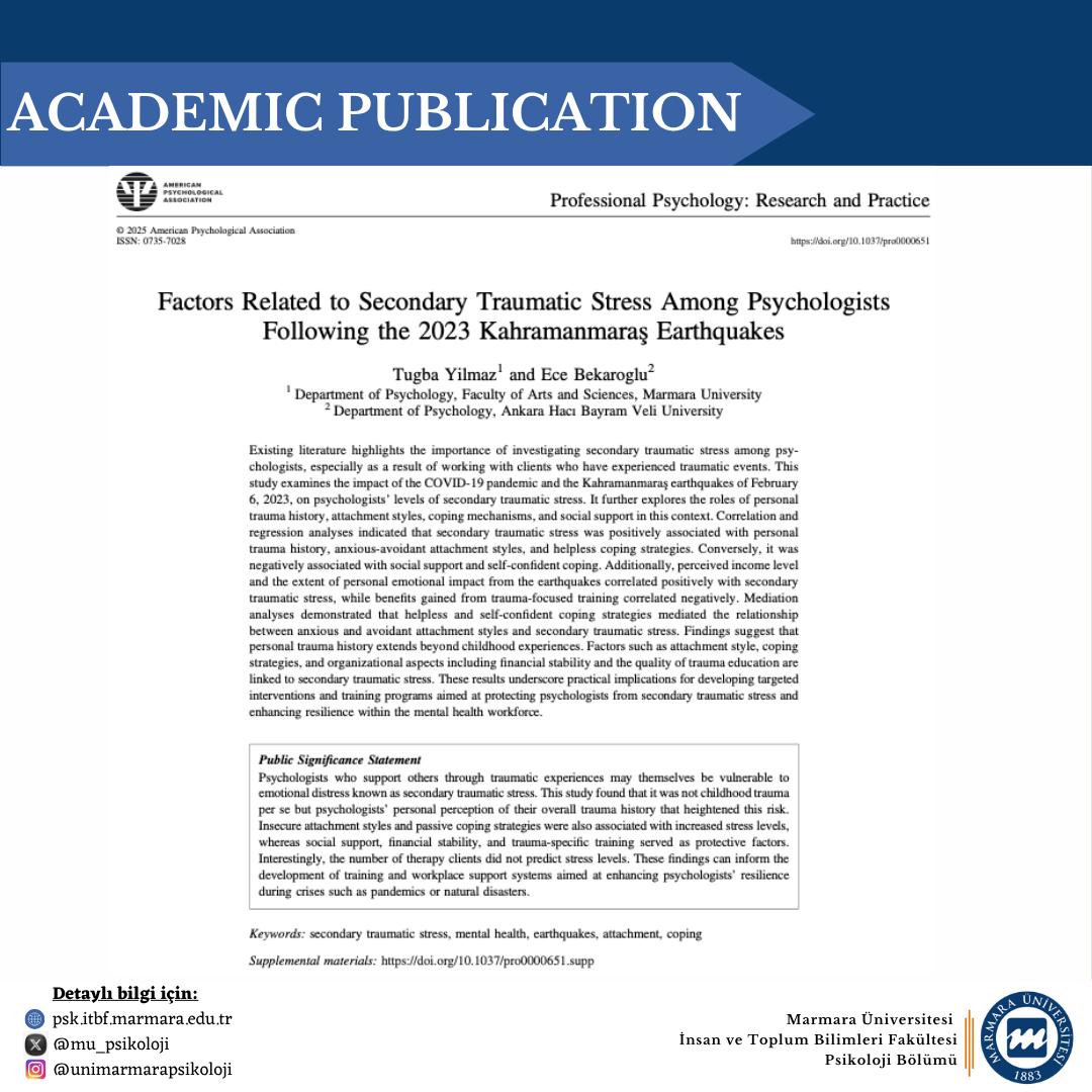 Our department professor, Assoc. Prof. Tuğba Yılmaz’s study with Assoc. Prof. Ece Bekaroğlu was published in the journal Professional Psychology: Research and Practice.