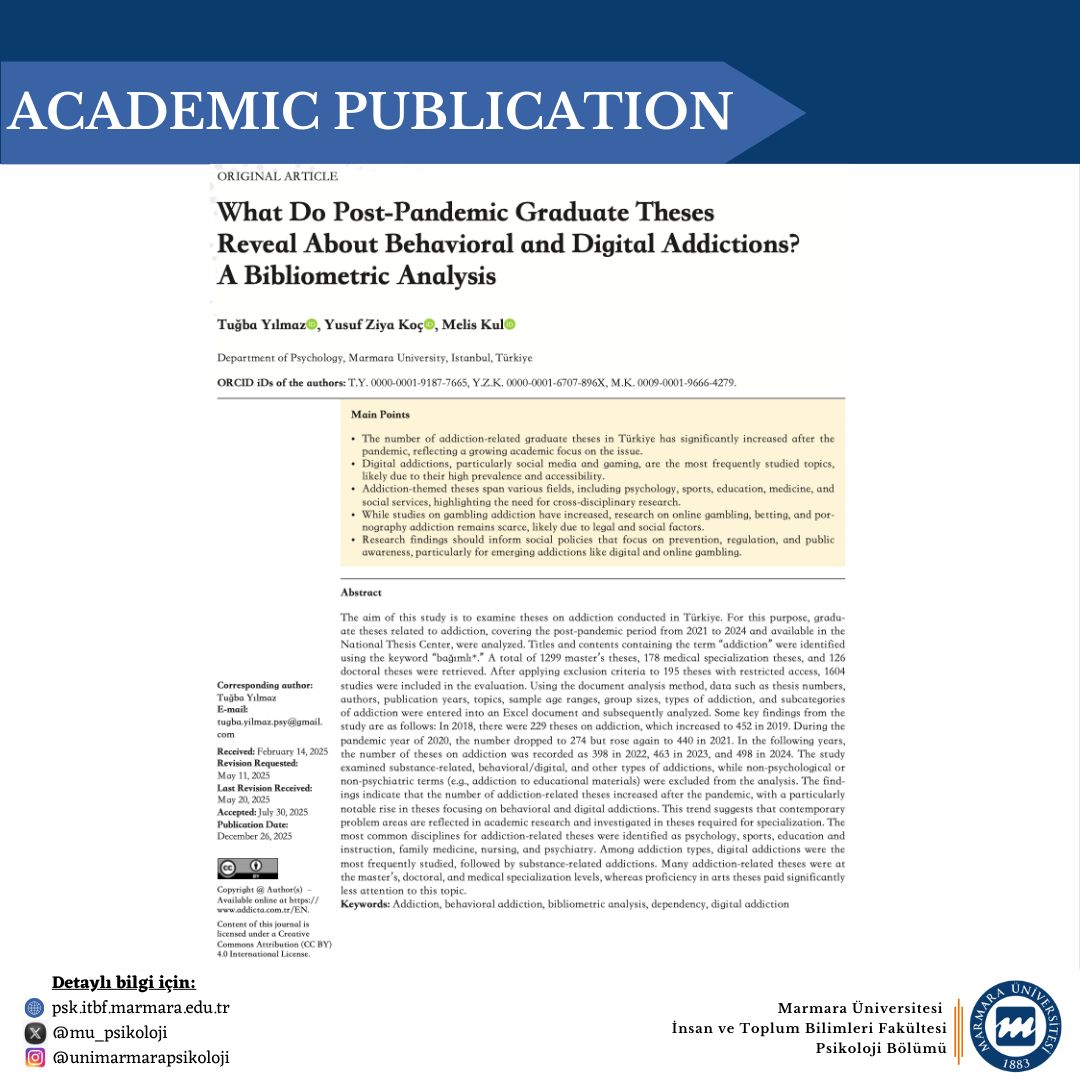 A bibliometric analysis conducted by faculty members of our department, Assoc. Prof. Tuğba Yılmaz and Res. Asst. Yusuf Ziya Koç, together with our student Melis Kul, has been published in ADDICTA: The Turkish Journal on Addictions.