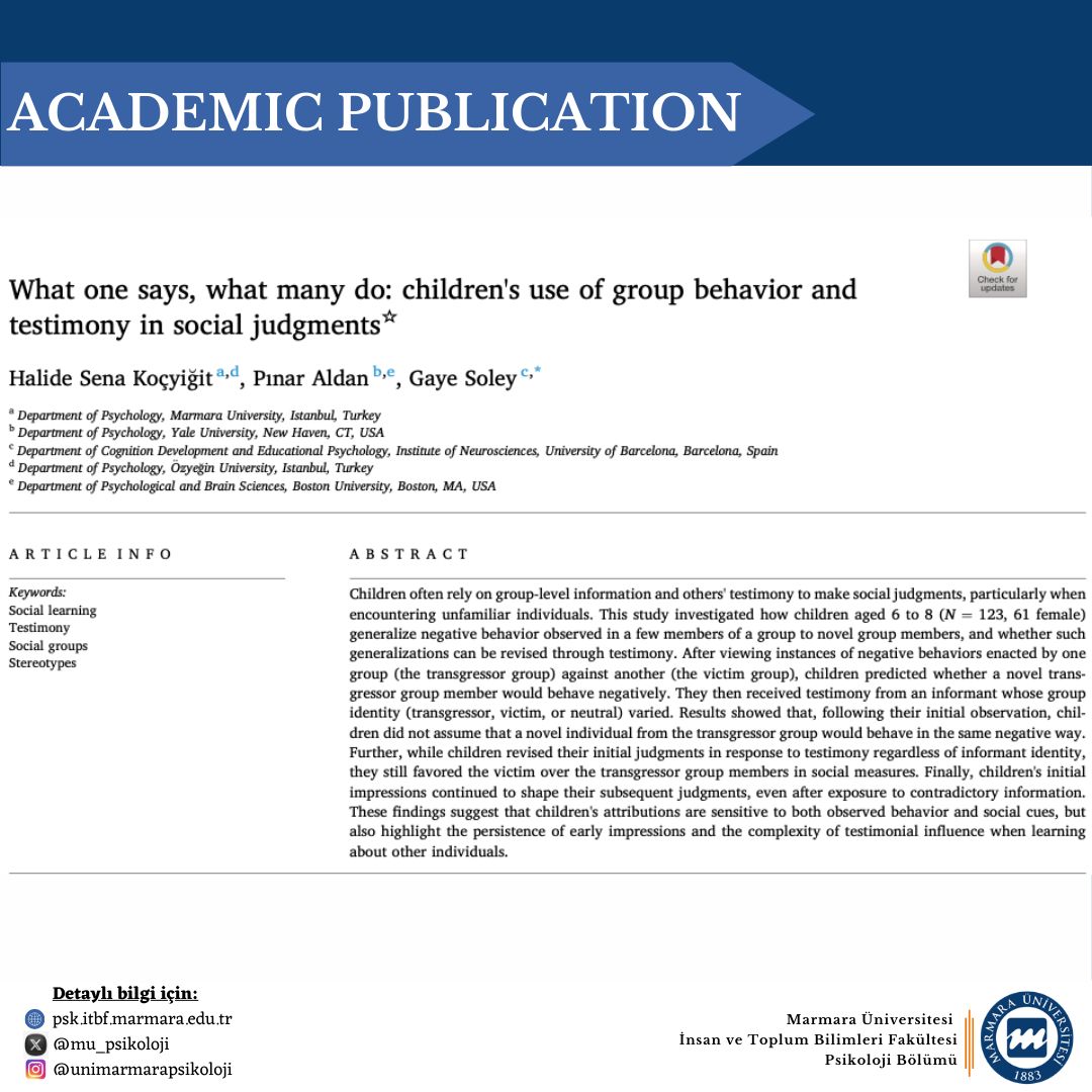 A study conducted by Research Assistant Halide Sena Koçyiğit, one of the academics in our department, together with her colleagues, was published in the journal Acta Psychologica.
