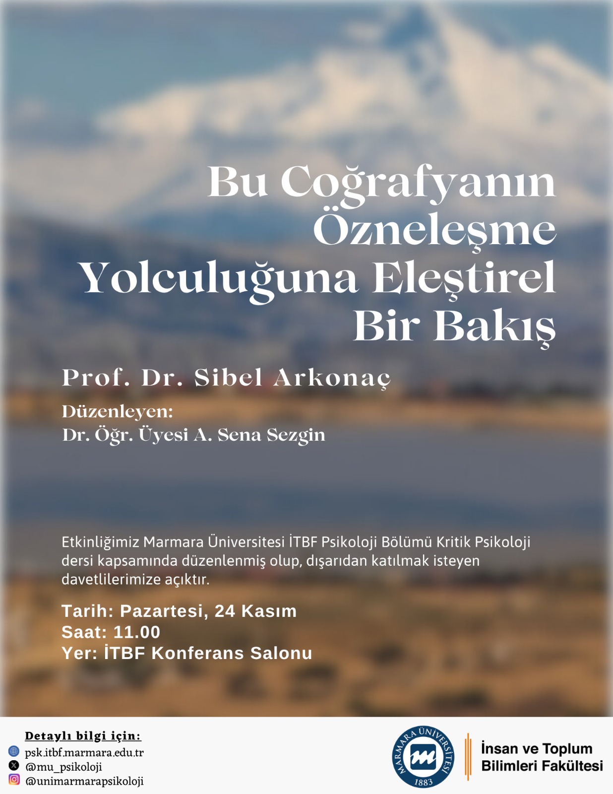 24 Kasım Pazartesi günü saat 11.00’de, Kritik Psikoloji dersi kapsamında Prof. Dr. Sibel Arkonaç’ı “Bu Coğrafyanın Özneleşme Yolculuğuna Eleştirel Bir Bakış” başlıklı konuşması için ağırlayacağız.