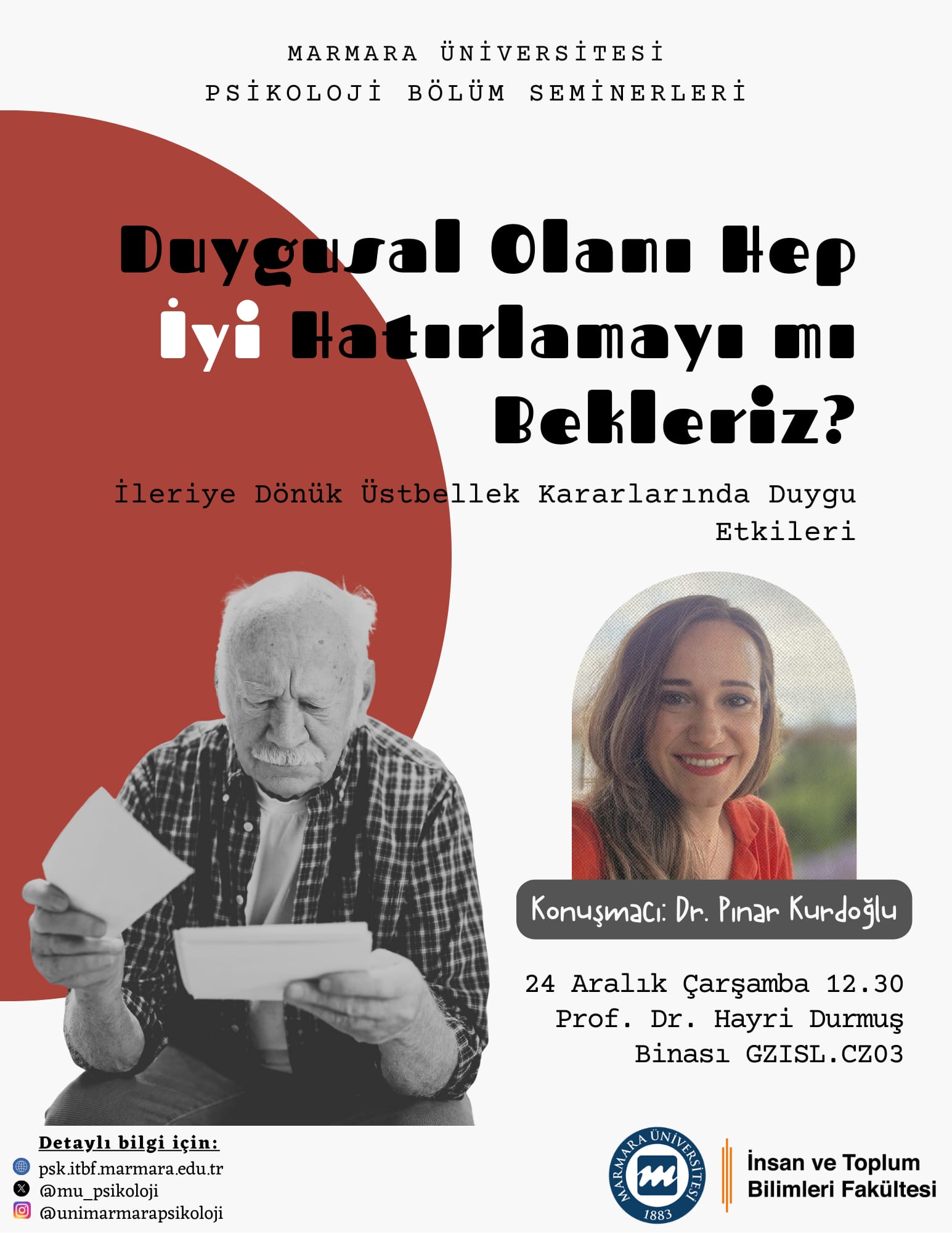 24 Aralık Çarşamba günü saat 12:30’da gerçekleştireceğimiz bölüm seminerimizde, Dr. Pınar Kurdoğlu Ersoy'un “Duygusal Olanı Hep İyi mi Hatırlamayı Bekleriz? İleriye Dönük Üst bellek Kararlarında Duygu Etkileri” başlıklı konuşmasını dinleyeceğiz.