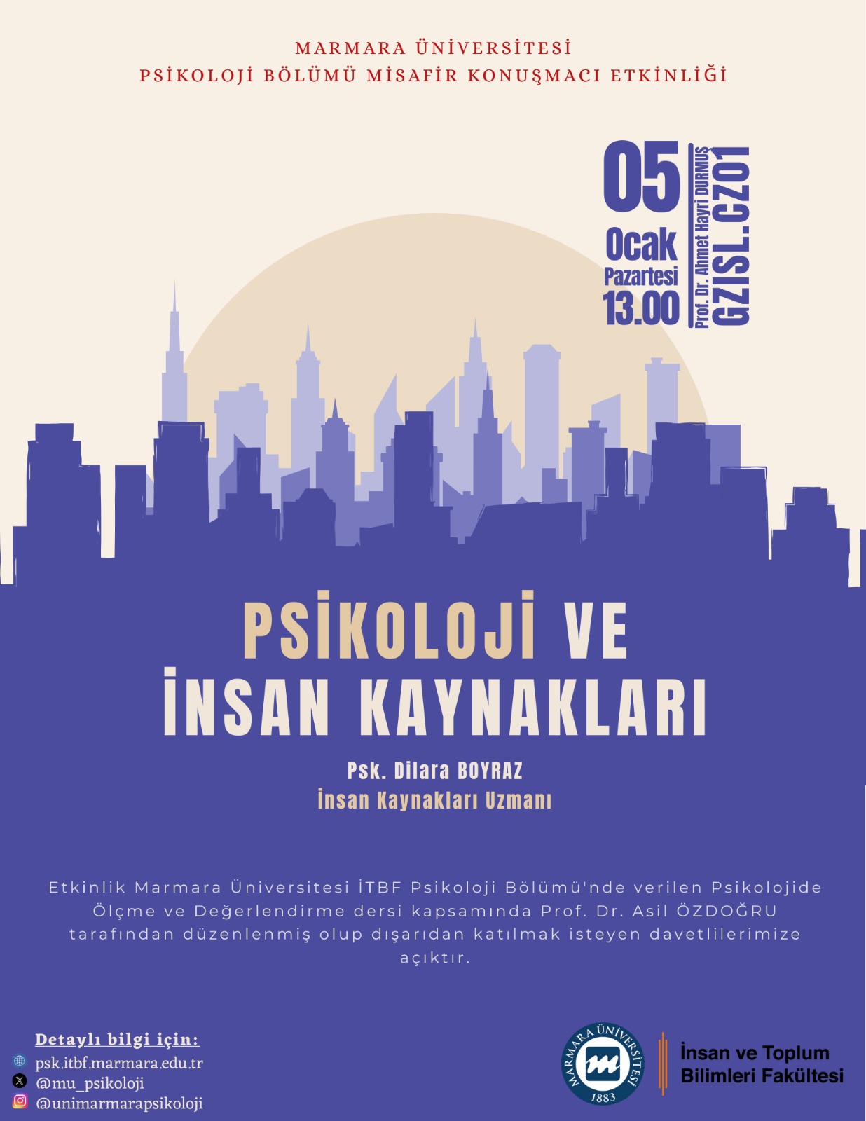 5 Ocak Pazartesi günü saat 13.00’da gerçekleştirilecek olan etkinlikte, Psk. Dilara Boyraz'ın “Psikoloji ve İnsan Kaynakları” başlıklı konuşmasını dinleyeceğiz.