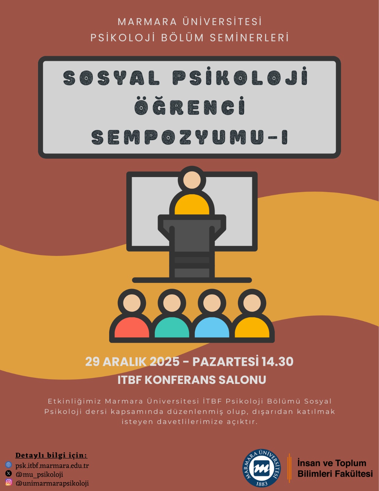 Etkinliğimiz Marmara Üniversitesi İTBF Psikoloji Bölümü Sosyal Psikoloji dersi kapsamında düzenlenmiş olup, dışarıdan katılmak isteyen davetlilerimize açıktır.