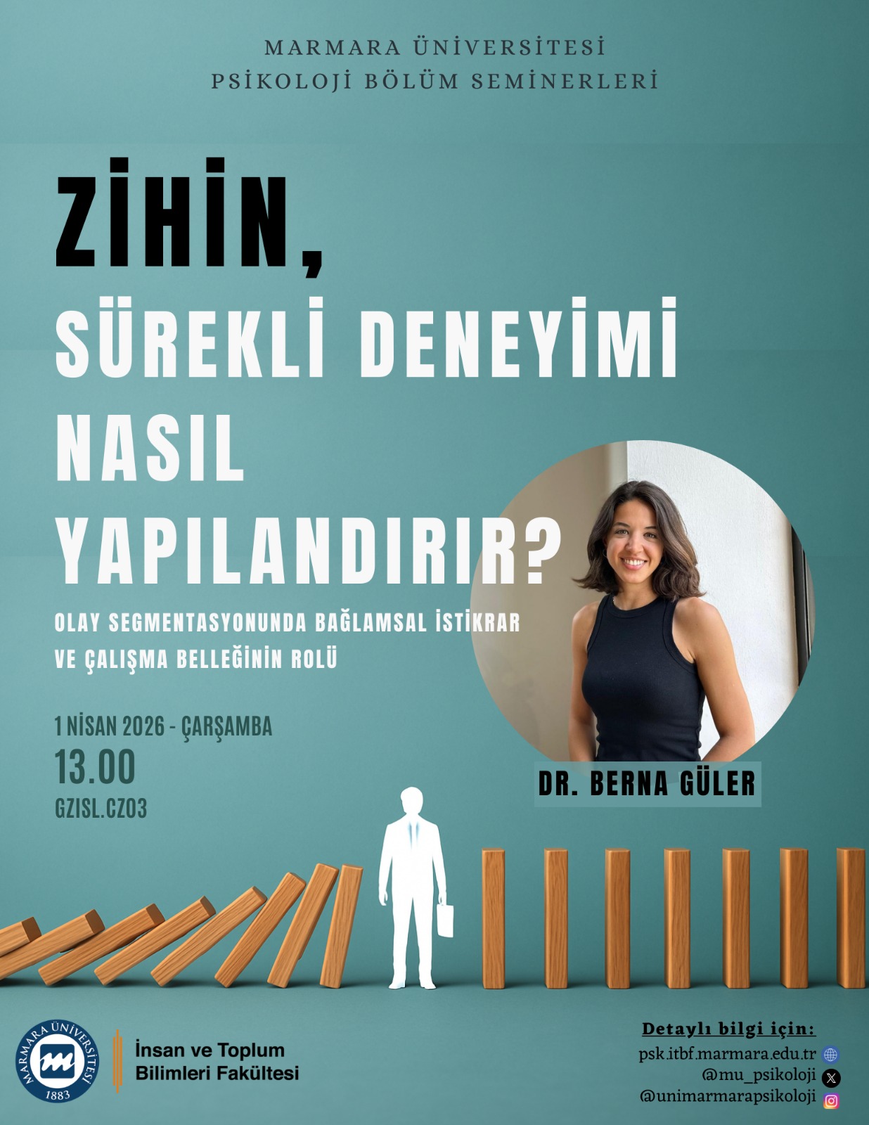 1 Nisan Çarşamba günü saat 13.00’da gerçekleştirilecek olan bölüm seminerimizde, Dr. Berna Güler'den 'Zihin, sürekli deneyimi nasıl yapılandırır? Olay segmentasyonunda bağlamsal istikrar ve çalışma belleğinin rolü' başlıklı konuşmasını dinleyeceğiz.