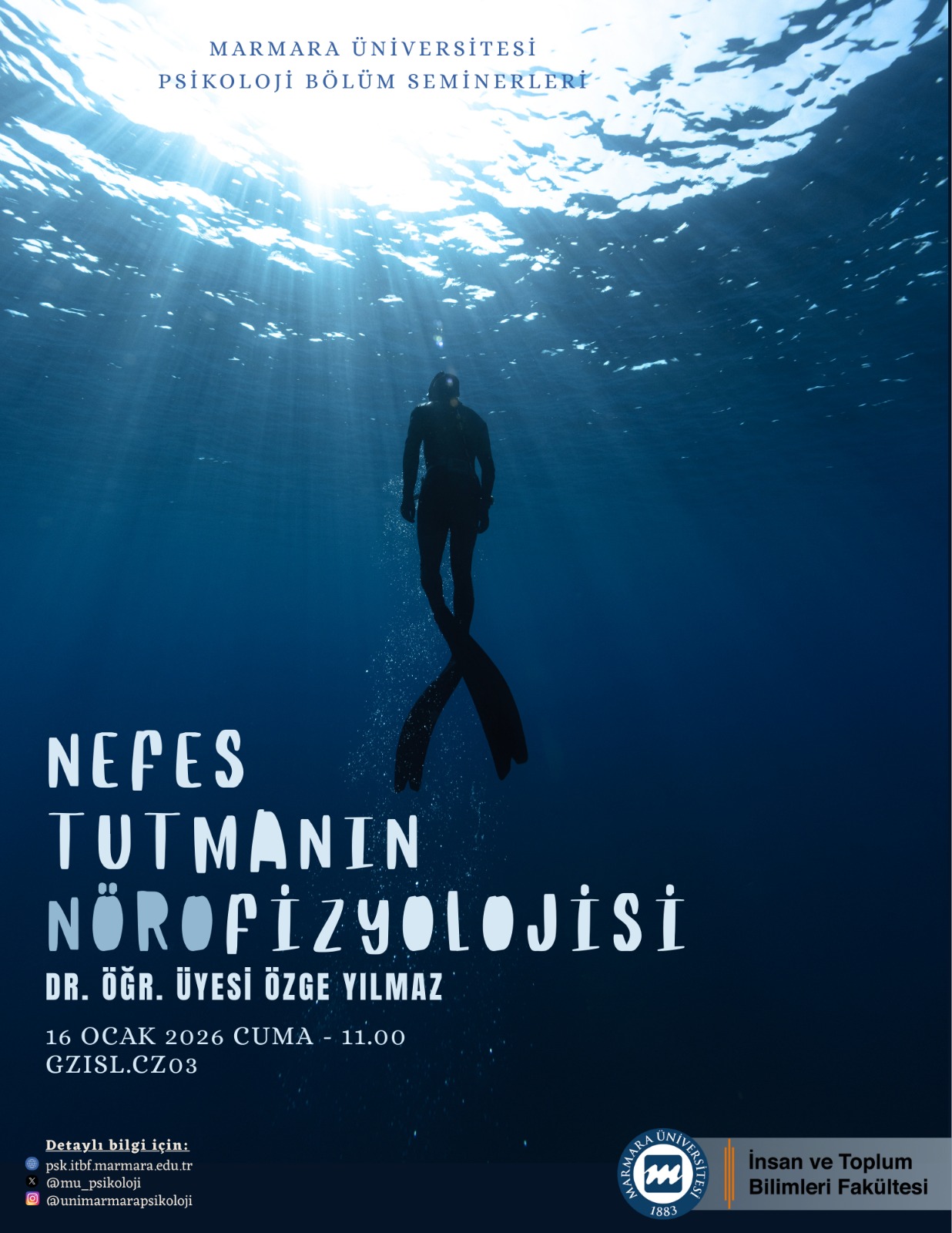16 Ocak Cuma günü saat 11.00’da gerçekleştirilecek olan etkinlikte, bölüm öğretim üyelerimizden Dr. Öğr. Üyesi Özge Yılmaz'ın 'Nefes Tutmanın Nörofizyolojisi' başlıklı konuşmasını dinleyeceğiz. Etkinlik dışarıdan katılıma açık olup ilgi duyan herkes davetlidir!