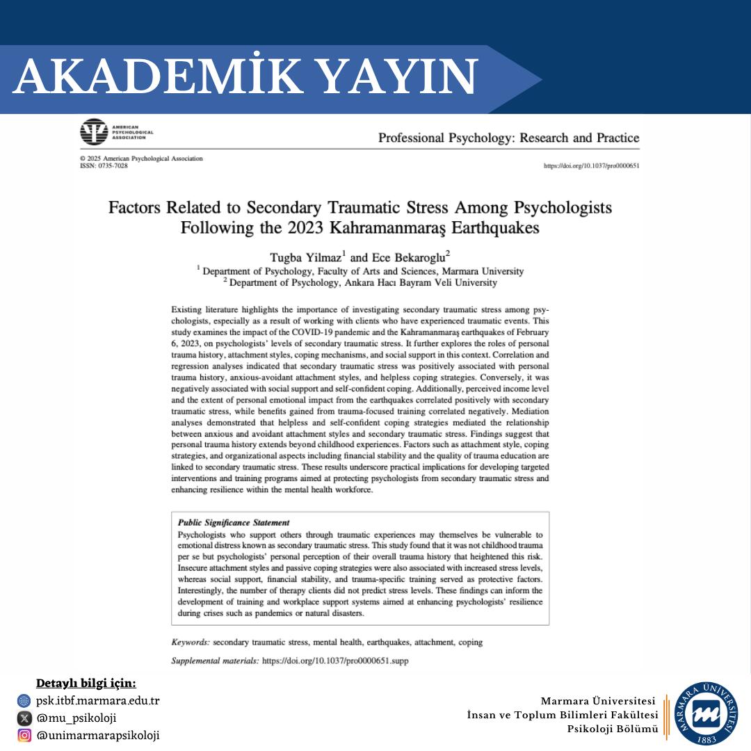 Bölüm hocalarımızdan Doç. Dr. Tuğba Yılmaz’ın (@psikologtugbayilmaz) Doç. Dr. Ece Bekaroğlu ile yürüttüğü çalışma Professional Psychology: Research and Practice dergisinde yayımlandı.