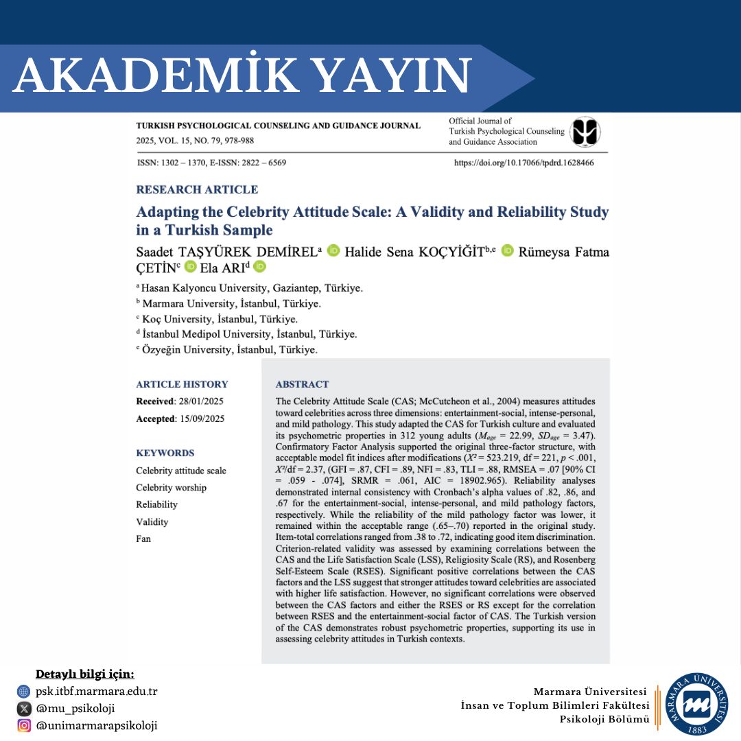 Bölümümüz akademisyenlerinden Arş. Gör. Halide Sena Koçyiğit’in meslektaşlarıyla yürüttüğü çalışma Turkish Psychological Counseling and Guidance dergisinde yayımlandı.
