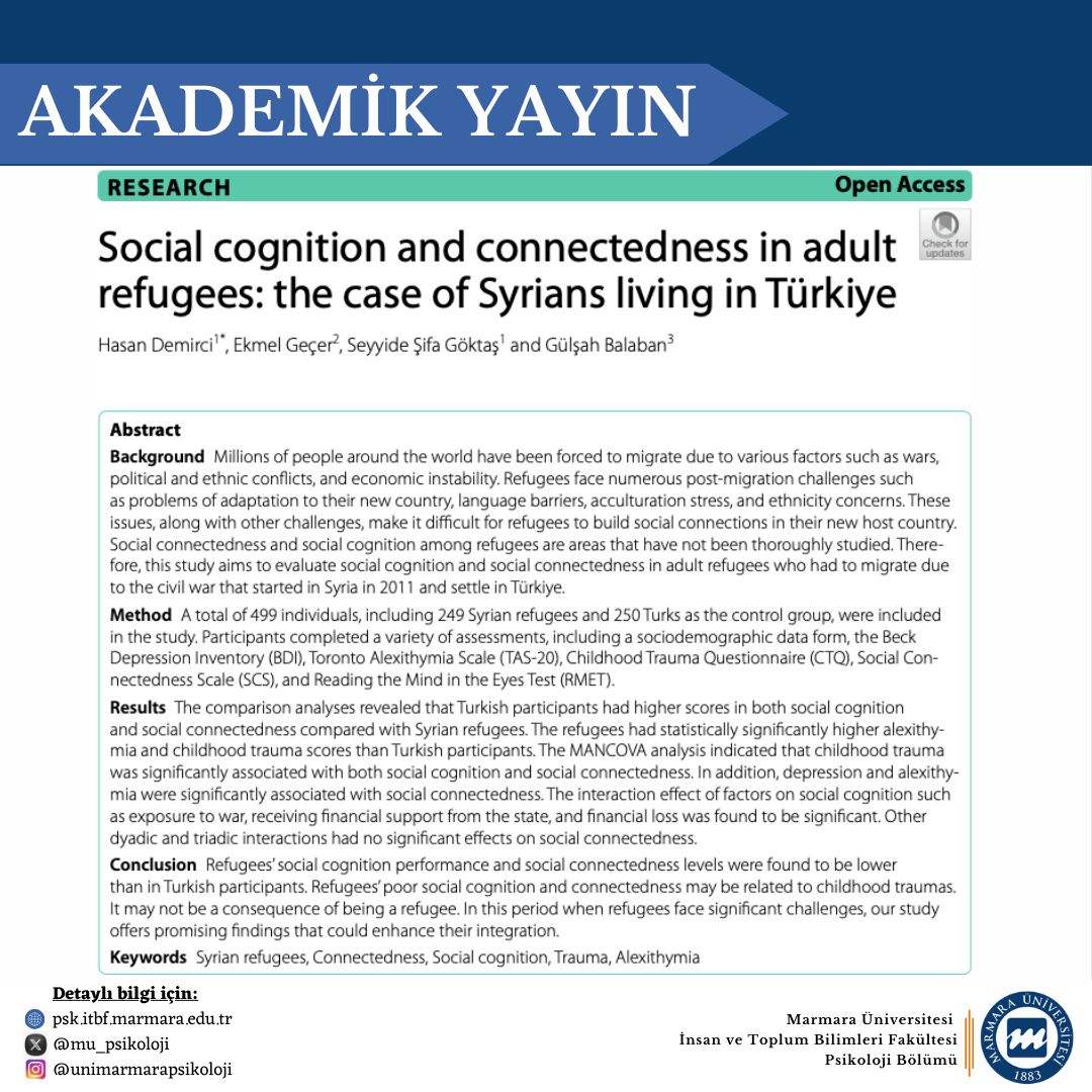 Sonuç olarak, mültecilerin sosyal biliş performansı ve sosyal bağlılık düzeylerinin Türk katılımcılara göre daha düşük olduğu bulundu. Mültecilerin zayıf sosyal biliş ve bağlılık düzeyleri, çocukluk travmalarıyla ilişkili olup, mülteci olmanın bir sonucu olmayabilir. Mültecilerin önemli zorluklarla karşılaştığı bu dönemde yapılan bu çalışma, onların entegrasyonunu artırabilecek umut verici bulgular sunmaktadır.